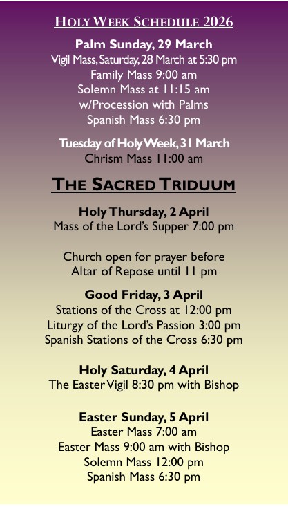 **Please note that for most Civil Holidays (Memorial Day, Labor Day, etc.) Mass will be at 9:00 am and there will be no Confessions. Always check the bulletin for the most up-to-date information regarding holiday weekends