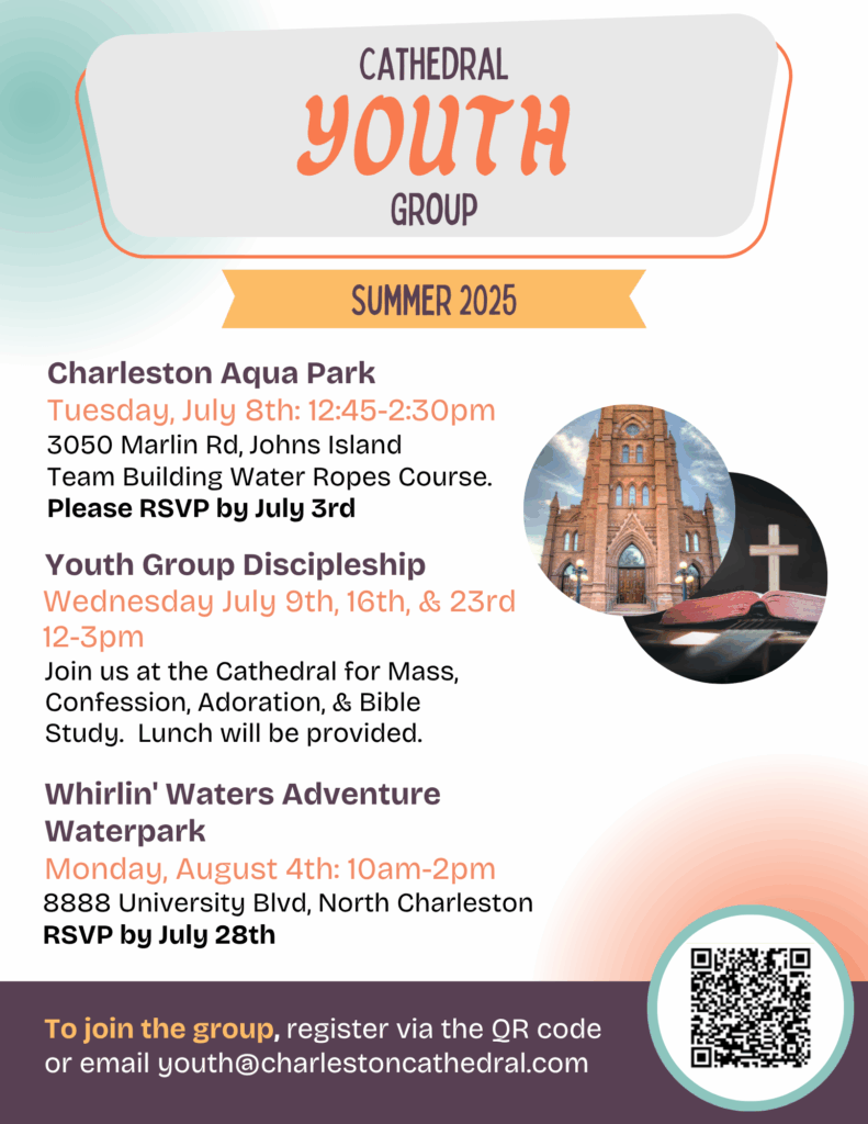 It provides opportunities for the Catholic Youth of Charleston to get together and meet new Catholic friends, pray together, and attend special social events. Check the Bulletin for the upcoming week’s event. Once registered (see below) parents will be able to come back to this site to RSVP for each week’s events, or RSVP through the email reminders they’ll receive.